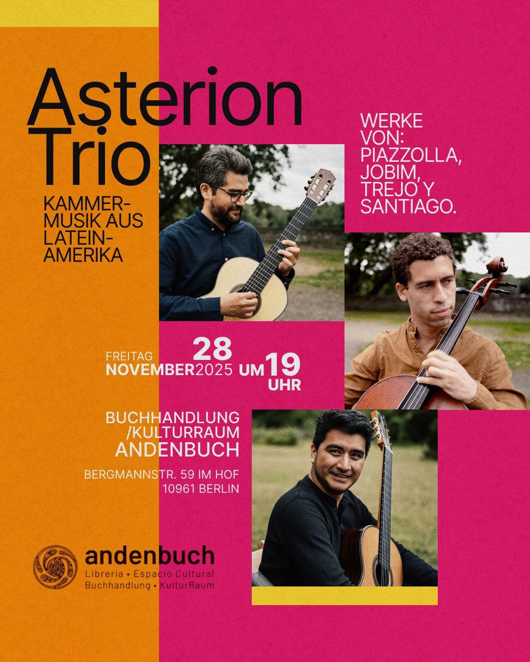 Asterion Trio, formado por Eric Trejo (Ciudad de México), Josep López (Trujillo, Perú) y Tony Rymer (Boston, EE. UU.), surgió en Berlín tras sus estudios en la Hochschule für Musik Hanns Eisler, donde sus integrantes se conocieron. Su afinidad por la música clásica y las tradiciones musicales de América Latina los inspiró a crear un ensamble que une ambos mundos con elegancia y originalidad, a través de obras de compositores de la región.
