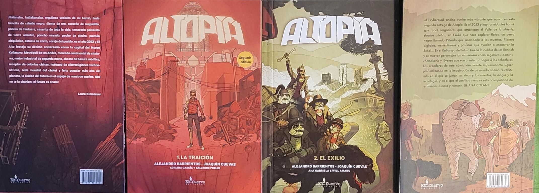 Joaquín Cuevas: (La Paz, 1980) es licenciado en Arquitectura. Trabaja como ilustrador, animador y autor de cómics desde el año 2004. Sus cómics han sido publicados en varias antologías de historieta latinoamericana y ha representado a Bolivia en festivales y bienales de arte en 8 países. En el campo de la animación destaca su trabajo como supervisor de animación en los cortometrajes Abuela Grillo (2009) y Pallay (2013). También ha liderado proyectos de gran alcance en ilustración, animación e historieta para instituciones y empresas privadas. Actualmente es propietario de la librería especializada en cómics La Viñeteca y docente en el departamento de Diseño Gráfico de la Universidad Católica Boliviana. Desde el año 2020 está desarrollando, junto con Alejandro Barrientos, diferentes proyectos de historieta, entre los que destaca Altopía, una novela gráfica seriada que se publica en Gokongo.co y que ya tiene dos libros impresos (editorial El Cuervo, 2022 y 2024 respectivamente).