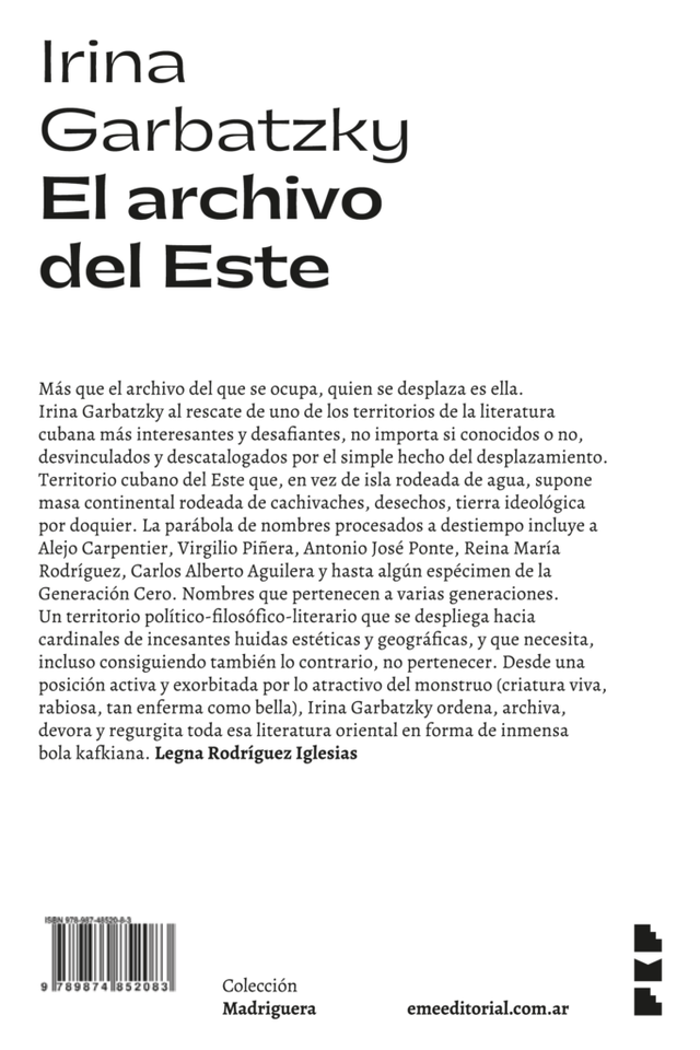 Más que el archivo del que se ocupa, quien se desplaza es ella. Irina Garbatzky al rescate de uno de los territorios de la literatura cubana más interesantes y desafiantes, no importa si conocidos o no, desvinculados y descatalogados por el simple hecho del desplazamiento. Territorio cubano del Este que, en vez de isla rodeada de agua, supone masa continental rodeada de cachivaches, desechos, tierra ideológica por doquier. La parábola de nombres procesados a destiempo incluye a Alejo Carpentier, Virgilio Piñera, Antonio José Ponte, Reina María Rodríguez, Carlos Alberto Aguilera y hasta algún espécimen de la Generación Cero. Nombres que pertenecen a varias generaciones. Un territorio político-filosófico-literario que se despliega hacia cardinales de incesantes huidas estéticas y geográficas,...(Fragmento) Legna Rodríguez Iglesias
